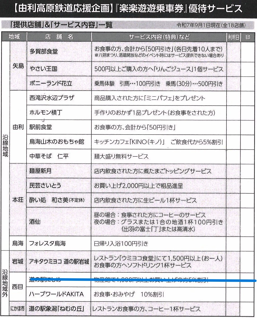 由利高原鉄道応援企画として各店舗様にご協力いただきまして、1日乗車フリー券「楽楽遊遊乗車券」をご呈示いただくと、お得なサービスが受けられる「楽楽遊遊乗車券優待サービス」を行っています。ご購入の際は、ぜひ、ご利用下さい。