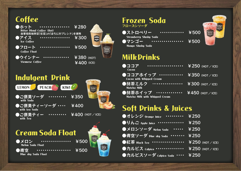 このたび、原材料価格や諸経費の高騰に伴い、誠に心苦しいのですが、カフェメニューの価格を改定させていただくこととなりました。今後も、皆さまにお楽しみいただける商品とサービスの提供に努めてまいりますので、何卒ご理解を賜りますようお願い申し上げます。