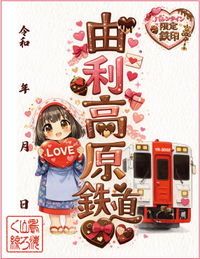 平素より由利高原鉄道をご利用いただき、誠にありがとうございます。このたび、令和8年2月1日より「2月限定鉄印」と「バレンタイン限定鉄印」の販売を開始いたします。2月限定は、雪が静かに積もる寒椿をモチーフに、冬の厳しさの中に凛と咲く美しさを表現いたしました。