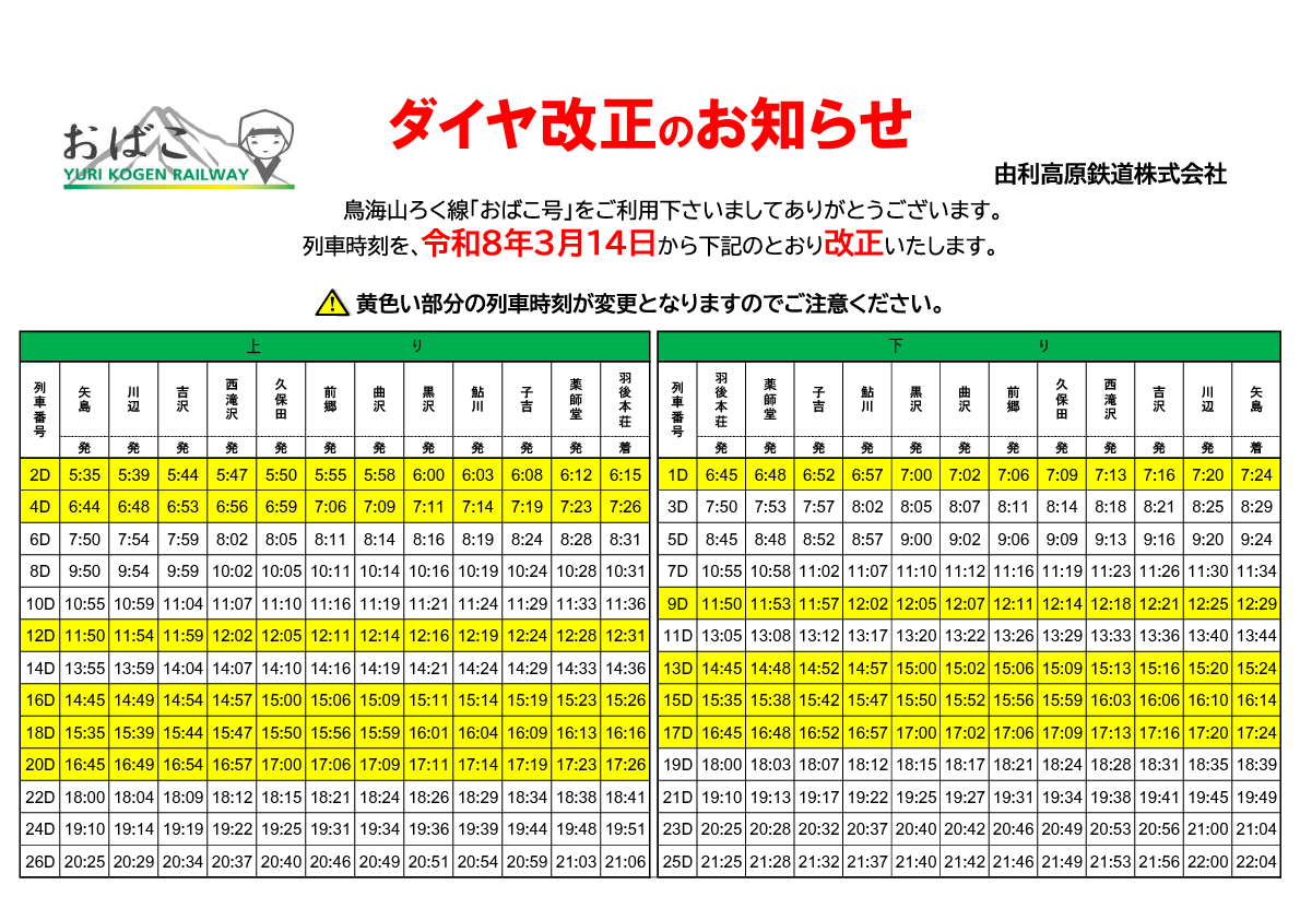 日頃より、由利高原鉄道をご利用いただき、誠にありがとうございます。令和8年3月14日(土)より、列車のダイヤを改正いたします。これに伴い、一部列車の時刻が変更となりますので、ご利用の際はご注意ください。引き続き、皆さまに快適にご利用いただけるよう努めてまいりますので、今後とも由利高原鉄道を宜しくお願いいたします。